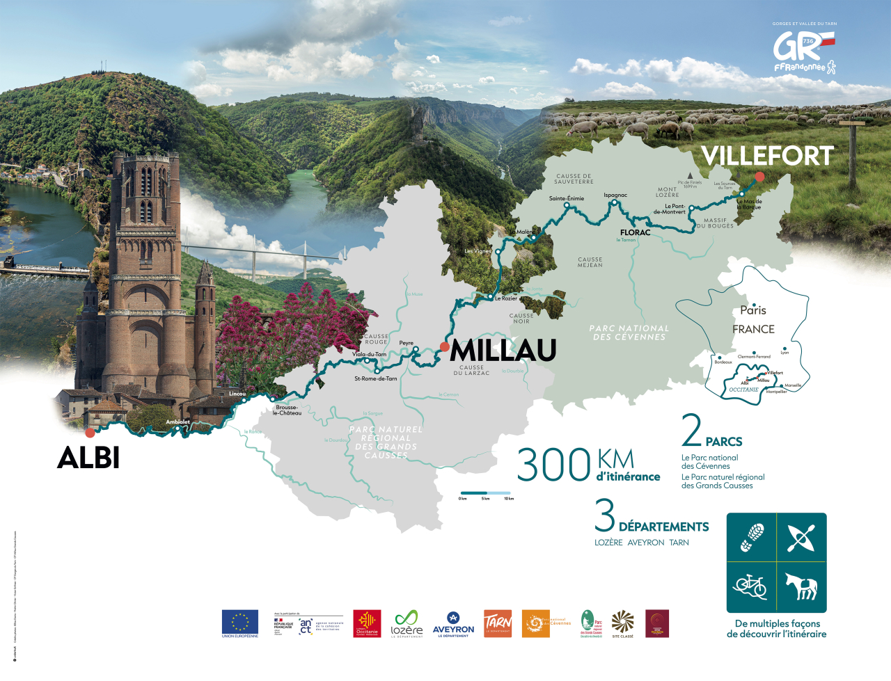 À travers le balisage horizontal blanc et rouge et le Topoguide du GR®736, accompagnez la rivière Tarn sur 316 km !