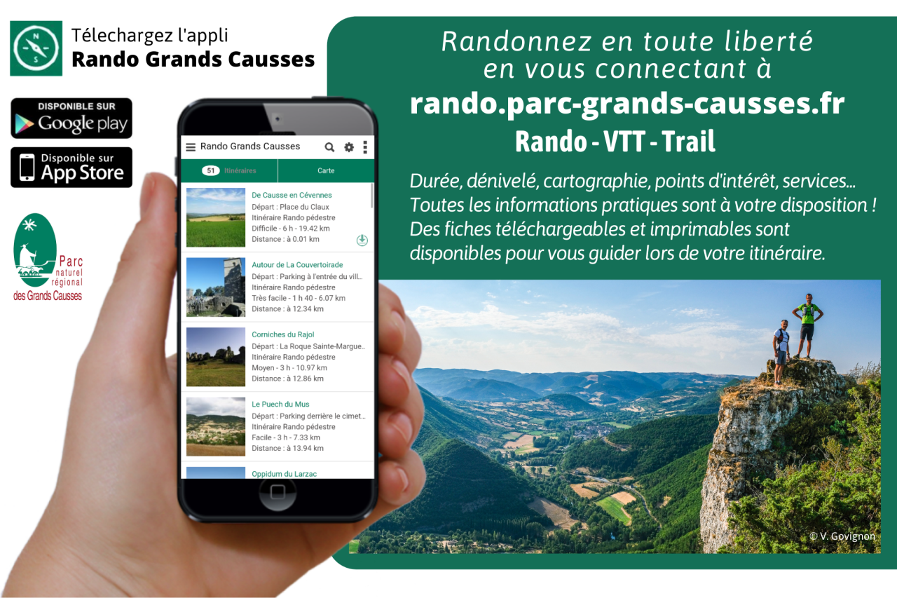 Le tracé du GR®736 est intégralement consultable sur l’application mobile Rando Grands Causses (également site internet : www.rando.parc-grands-causses.fr).