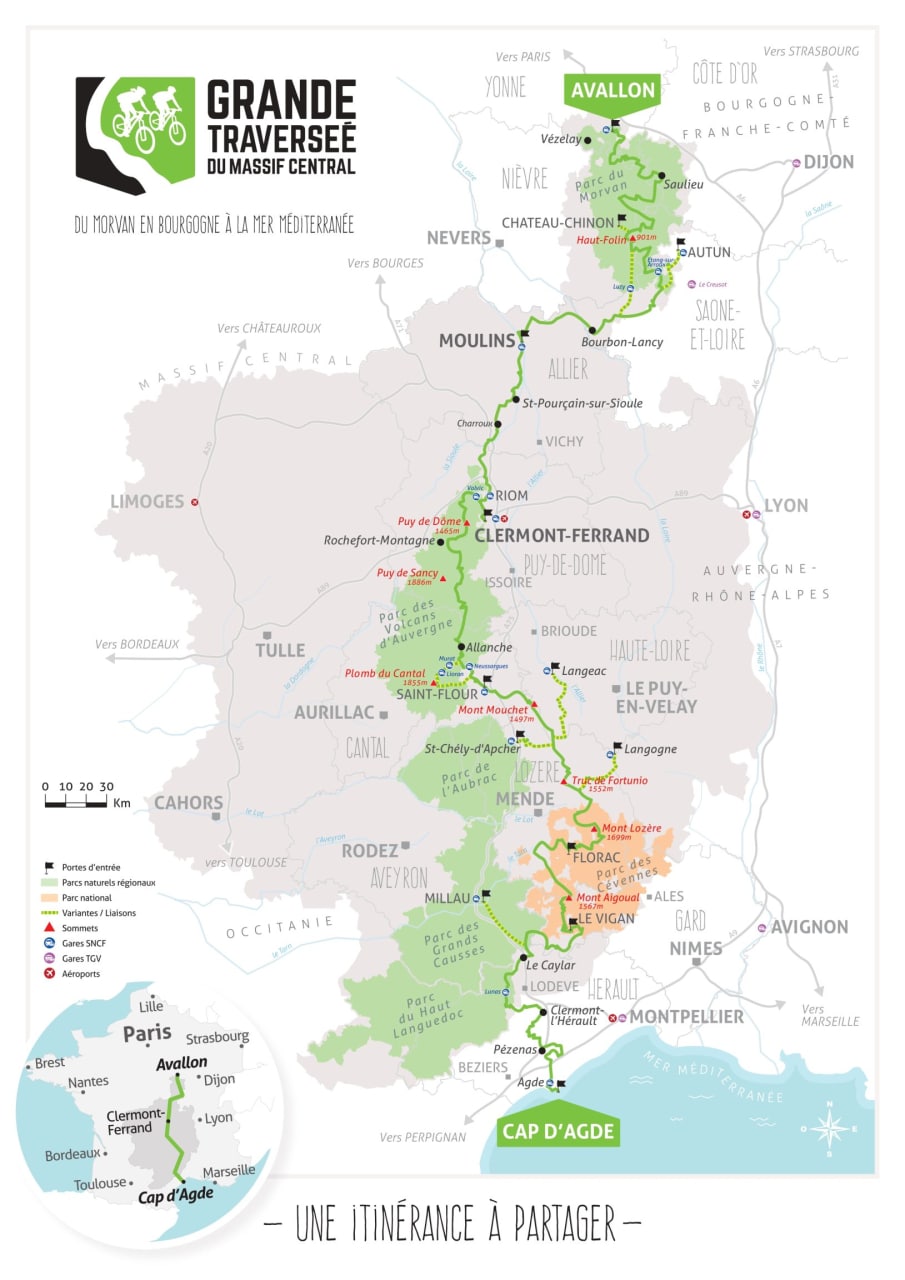 La Grande Traversée du Massif Central (GTMC) est un parcours mythique traversant les paysages de 4 parcs naturels régionaux et d'un parc national. La GTMC labellisée par la Fédération Française de Cyclisme (FFC), parcourt l’intégralité du Massif central du nord au sud et se classe parmi les plus longues traversées VTT de France.