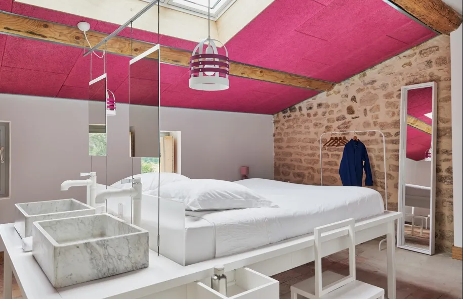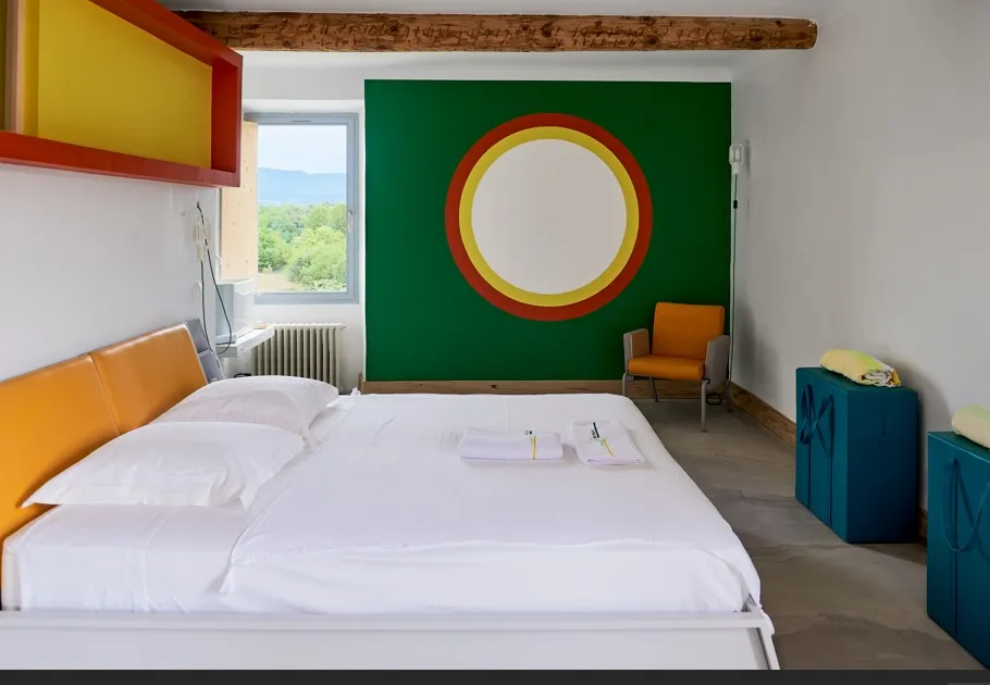 Le domaine offre une large palette d’hébergements : 5 chambres d’hôtes, 2 studios gîtes, 2 maisons gîtes, 3 écolodges et 1 appartement, tous conçus et designés par Matali Crasset, l’une des figures majeures du design français contemporain. Un ancien bassin agricole a été transformé en piscine pour le plaisir des hôtes.