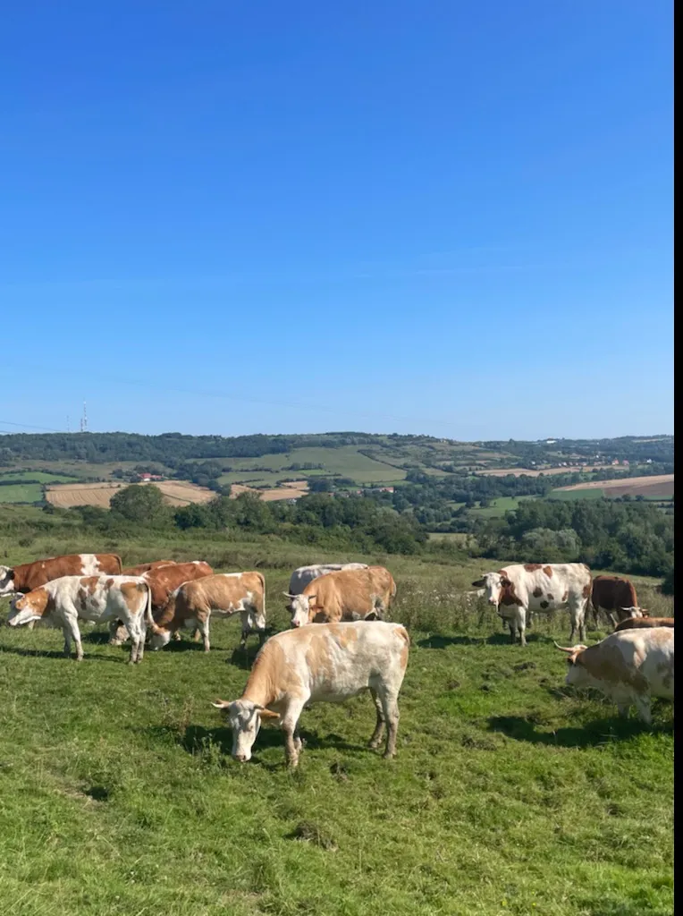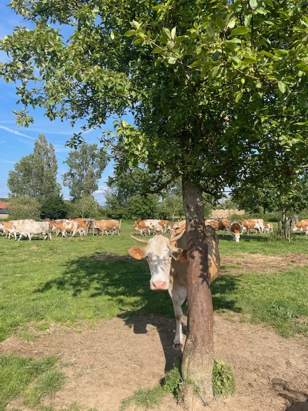 Ils élèvent une cinquantaine de vaches, en système bio entièrement à l’herbe, c’est-à-dire qu’ils nourrissent leurs animaux uniquement grâce à leurs prairies. Ils ont choisi la Simmental, race mixte capable de produire à la fois du lait et une viande de qualité ; ils ont conservé cette race même après l’arrêt de l’atelier laitier car elle est bien adaptée au pâturage. Aujourd’hui, ils se consacrent à la production de viande qu’ils commercialisent en direct à la ferme ou bien localement auprès de traiteurs, restaurateurs, magasins bio ou cantines scolaires.