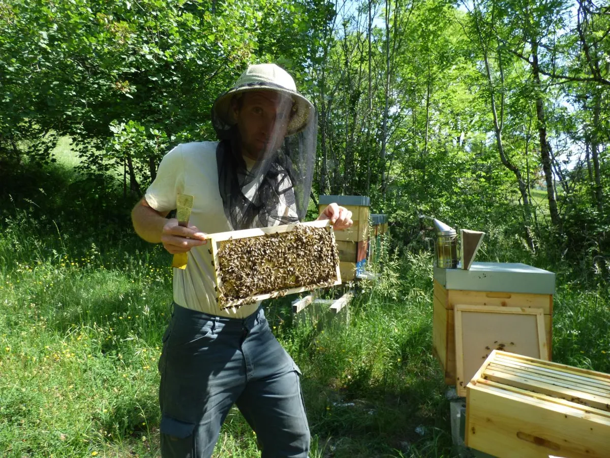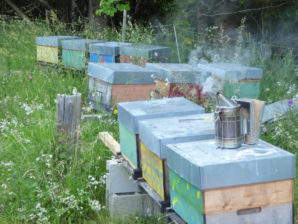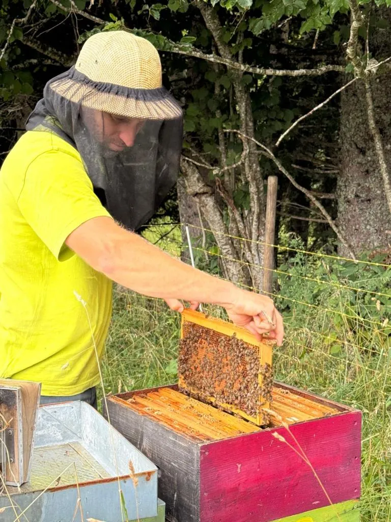 Yohann, l’apiculteur, a travaillé une quinzaine d’année en tant que fromager en alpage, puis s’est installé en tant qu’apiculteur en 2019. Il possède environ 150 ruches, et 50 essaims pour le renouvellement. L’objectif est d’atteindre 200 ruches en production.