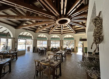Les repas sont servis dans des salles intérieures cosy ou sur la terrasse, avec des cheminées en hiver et une ambiance détendue toute l’année.