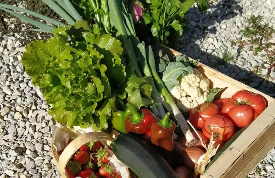 Notre surplus de production est également commercialisé sous forme de paniers de fruits, légumes et autres produits de saison, sur commande, distribués tous les mardis soirs à la ferme.