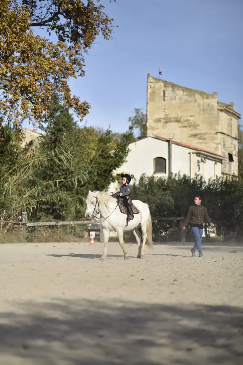 Le Mas Saint Germain vous propose une promenade à cheval hors du commun : nous allons chercher les chevaux au pré, chacun brosse son cheval et le selle avec notre aide, nous vous mettons en selle et vous emmenons pour une heure de promenade sur notre exploitation agricole bio, en vous montrant de l’intérieur notre ferme familiale : les cultures, l’activité d’élevage de chevaux et de taureaux Camargue… Nous continuons jusqu’au très sauvage Etang du Vaccarès, peuplé d’oiseaux.