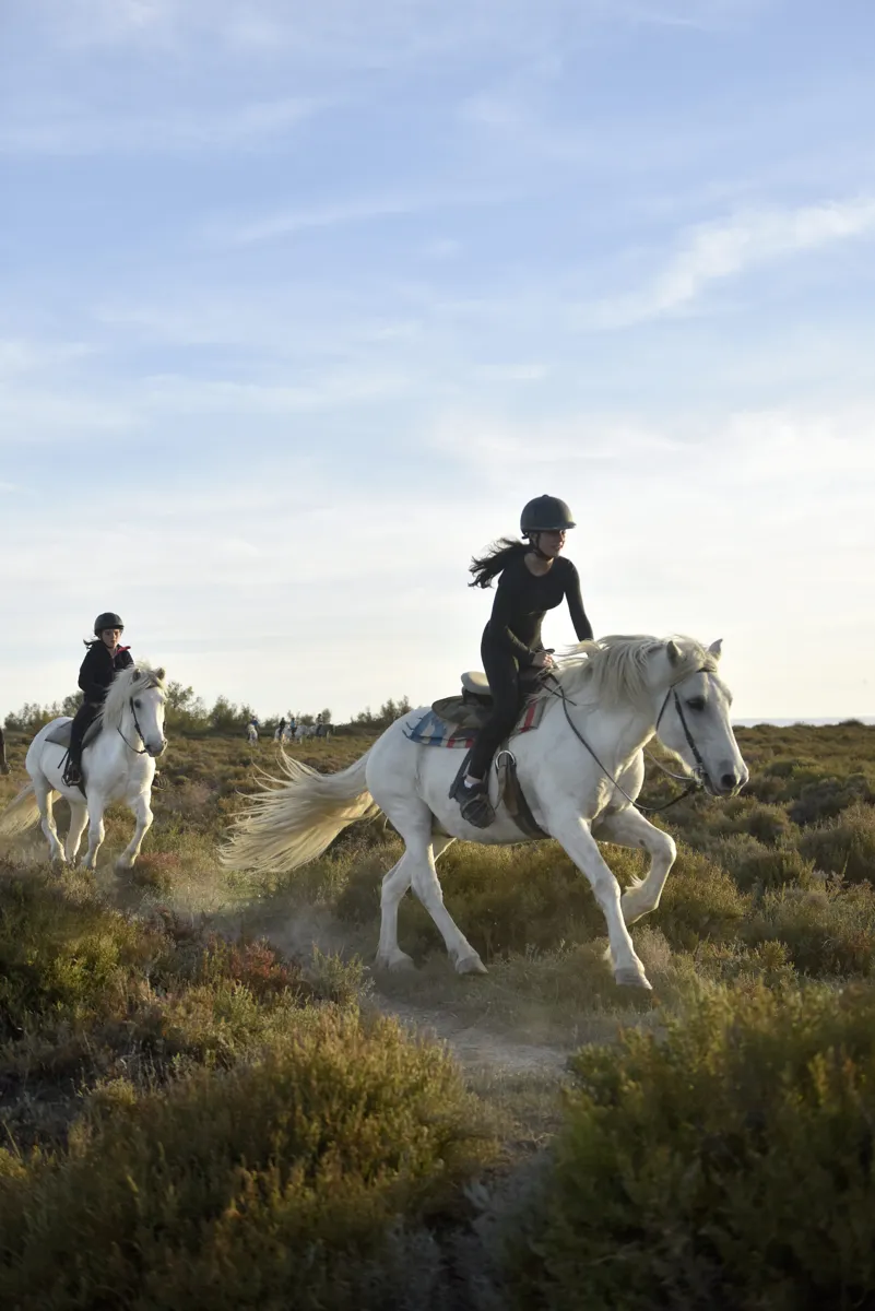 vivez des promenades guidées au rythme des chevaux à travers marais, plages et paysages sauvages. Une immersion élégante et authentique dans la nature camarguaise, accessible à tous niveaux.
