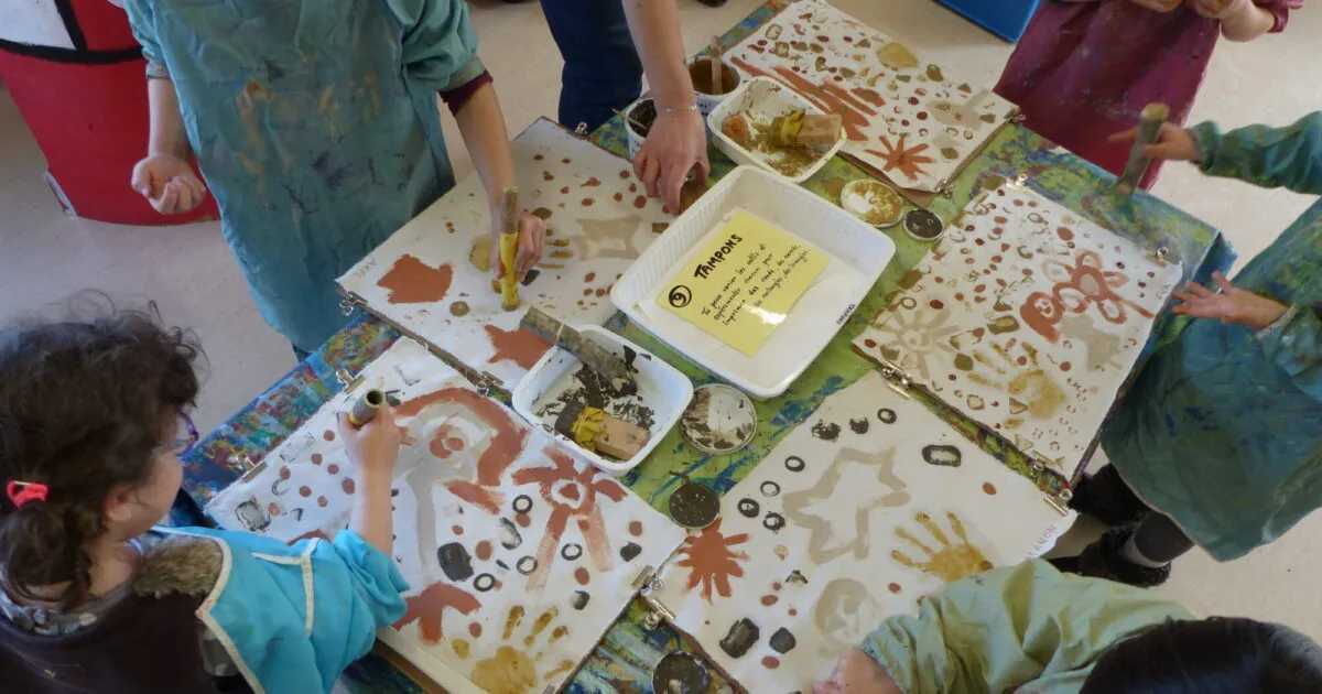 Ils fabriquent ensuite les peintures naturelles à partir de l’argile « brute » (concasser, tamiser, mettre à l’eau, ajouter la colle de farine, mélanger). Chacun compose ensuite son tableau avec les 6 ou 7 couleurs fabriquées, en utilisant différents médiums (à la main, avec des tampons « fait maison ») au pinceau…